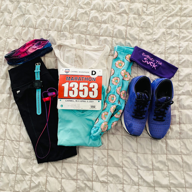 Race morning came quickly, as it always does. After getting up, getting dressed, and making myself some breakfast to go, I got in the car and headed up to Carmel. I had my usual pre-race butterflies (I swear marathons will never not be scary), and I think I was extra nervous because of my ultimate goal of running sub-5. This would be my third attempt at this goal and I had worked so hard over the last year to improve my running. I know I had grown as a runner during the pandemic, but I really had no idea how that would translate to the race. I was NERVOUS, y'all. When the time approached I headed down to the start area and did a bit of a warm up and stretch before heading to the start line.